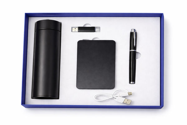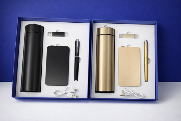 Bộ Giftset Sổ da và Bút ký kim loại: Được đóng gói trong hộp xi lót lụa/mút định hình cao cấp. Doanh nghiệp có thể khắc tên riêng của người nhận lên bút để gia tăng giá trị cảm xúc.