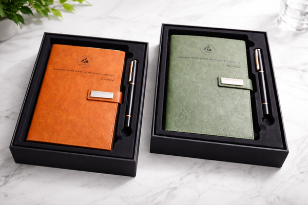 Sổ bìa da ép kim logo kết hợp cùng bút kim loại khắc laser mang lại vẻ đẹp đẳng cấp, phù hợp cho các sự kiện mang tính học thuật, tài chính hoặc bất động sản.
