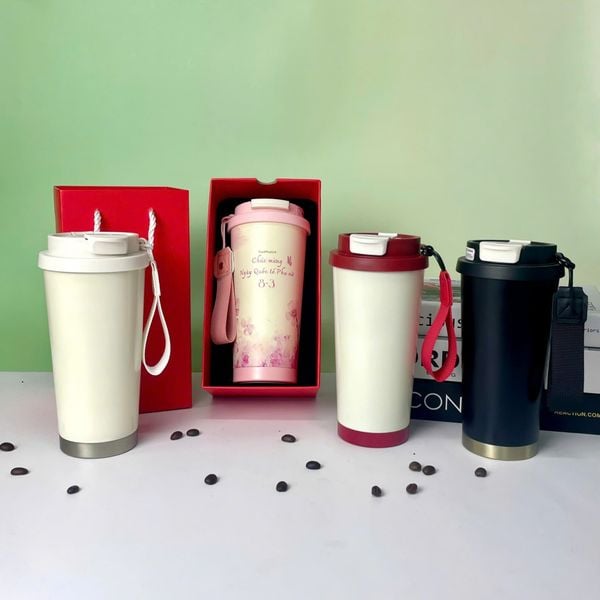 Bình giữ nhiệt inox: Dung tích 500ml, cấu tạo inox 304, có khả năng giữ nhiệt từ 6-8 tiếng. Khắc laser hoặc in UV logo công ty lên thân bình.